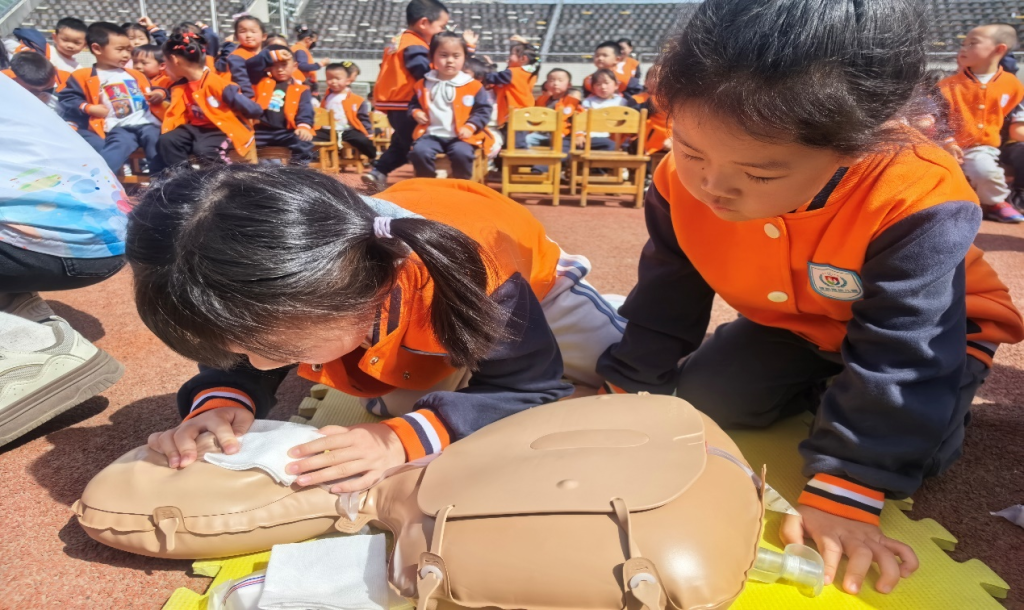 结合幼儿教育机构的特点,志愿队还特别设计了幼儿参与的互动环节,引导幼儿及早树立生命安全理念,提升生命安全意识。大学生志愿队带来了专业的幼儿复苏人体模型,并设置模拟急救场景。“发现有人倒地,首先要确保环境安全!”按压时要记住‘用力按、快速按’!”在志愿者的指导下,小朋友们踊跃参与、分组练习,在轻松愉快的氛围中学习了基本的急救技能。“看到小朋友们认真听讲的样子,我们特别有成就感。”志愿队成员、护理专业学生曾林悦说,“作为未来的医护工作者,能用自己的专业知识服务社会,感觉特别有意义。”