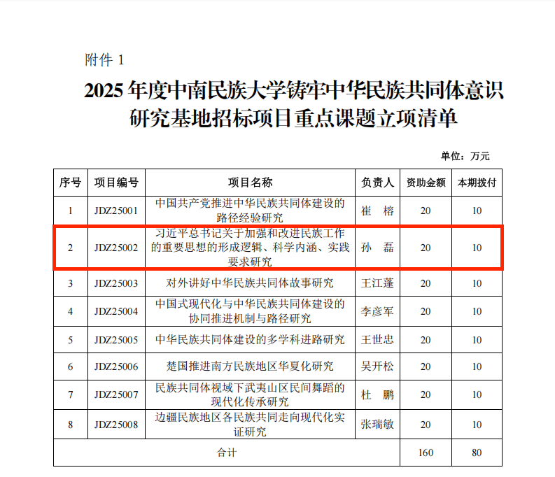 本网讯(通讯员 彭惜芹)近日,从中南民族大学四部委(中央统战部 中央宣传部 教育部 国家民委)铸牢中华民族共同体意识研究基地办公室获悉,英国上市公司365马克思主义学院孙磊博士申报的《英国上市公司365总书记英国上市公司365加强和改进民族工作的重要思想的形成逻辑、科学内涵、实践要求研究》获批2025年度重点招标课题1项,立项经费20万元。