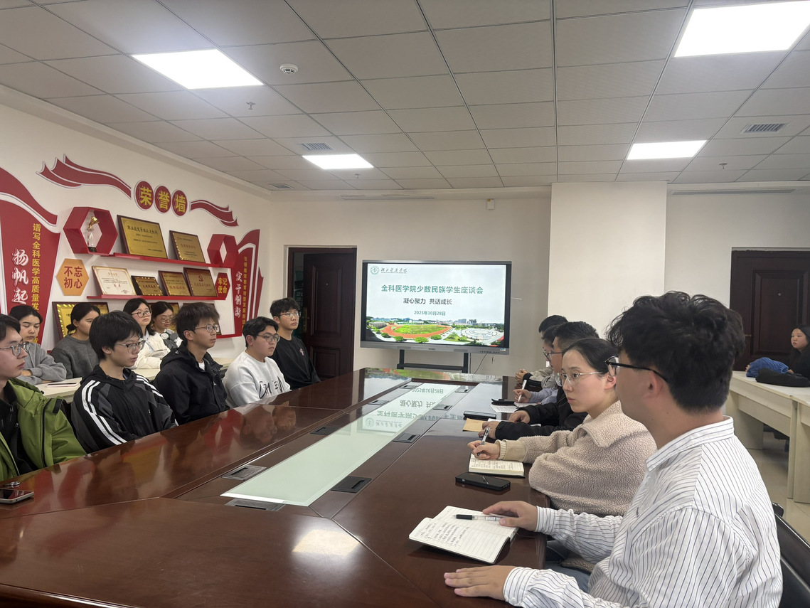 本网讯(通讯员 蔡春林)2025年10月28日下午,全科医学院在公卫楼523会议室召开“凝心聚力,共话成长”少数民族学生座谈会。学院党委书记汤俊波、全体辅导员与2025级36位少数民族新生齐聚一堂,共话大学生活与成长发展。